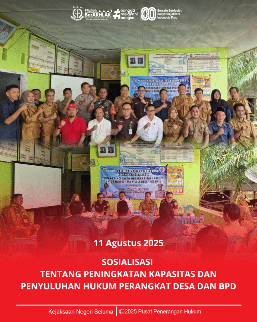 Kejaksaan Negeri Seluma melalui Kasubsi II Intelijen Egen Novghantara, S.H. dan Anggota menghadiri sekaligus menjadi narasumber dalam kegiatan Sosialisasi Tentang Peningkatan Kapasitas dan Penyuluhan Hukum Perangkat Desa dan BPD diselenggarakan di Kantor Desa Talang padang Kabupaten Seluma pada hari Senin tanggal 11 Agustus 2025.