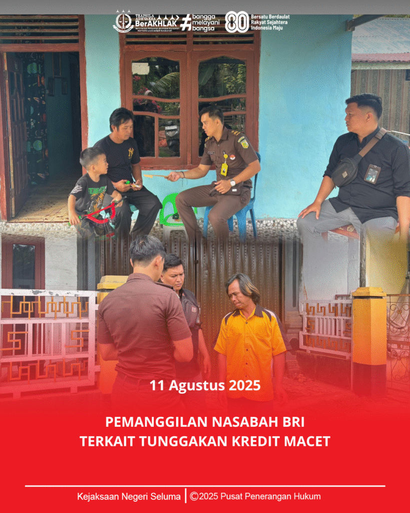 Senin, 11 Agustus 2025 bidang Datun Kejaksaan Negeri Seluma melalui staf Perdata dan Tata Usaha Negara Tasya May Shella Hasibuan, S.H. dan anggota melaksanakan giat Pemanggilan Nasabah BRI Terkait Tunggakan Kredit Macet yang bertempat di Kecamatan Semidang Alas Maras.Kegiatan tersebut juga di dampingi oleh Tim BRI Unit Tedunan .