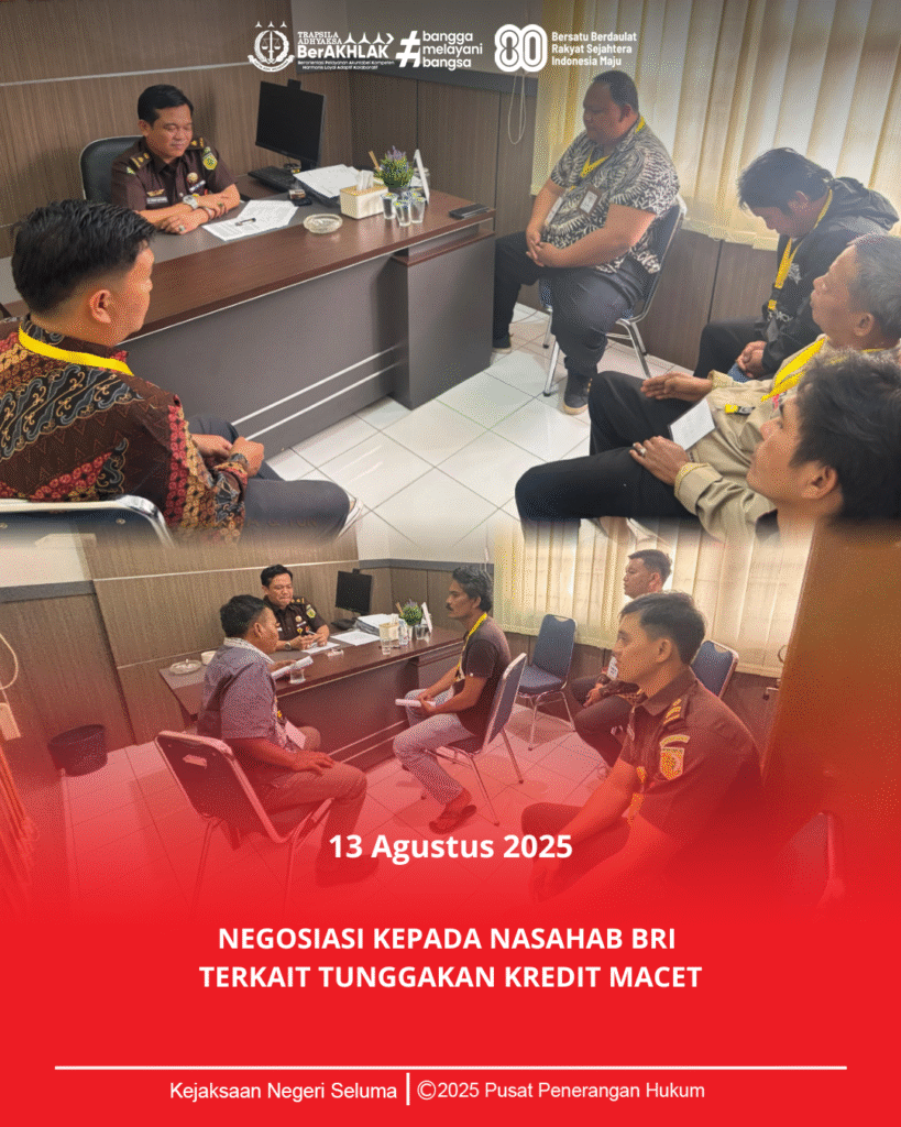 Rabu, 13 Agustus 2025 bidang Datun Kejaksaan Negeri Seluma melalui Kepala Seksi Perdata dan Tata Usaha Negara M.Ridho Saputra, S.H., M.H., Jaksa Pengacara Negara Eza Winda Gitalastri, S.H., M.H. dan anggota melaksanakan giat negosiasi kepada nasabah BRI terkait tunggakan kredit macet bertempat di ruangan Perdata dan Tata Usaha Kejari seluma. Kegiatan tersebut juga di dampingi […]