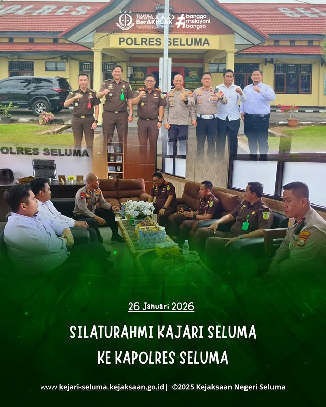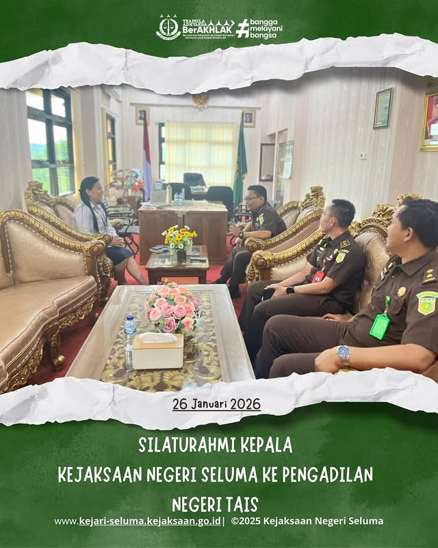 Seluma,Kepala Kejaksaan Negeri Seluma Bapak Janu Arsianto, S.H., M.H beserta Kasi intelijen dan Kasi Pidum melaksanakan silaturahmi dan kunjungan ke Pengadilan Negeri Tais . Kegiatan ini bertujuan untuk mempererat hubungan kelembagaan serta meningkatkan sinergi dan koordinasi antar-aparat penegak hukum dalam rangka mewujudkan penegakan hukum yang profesional, transparan, dan berkeadilan, Senin (26/01/2026).