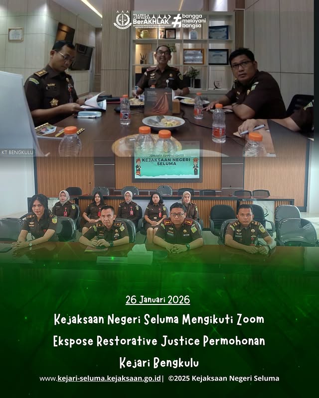 Seluma, Kejaksaan Negeri Seluma Bapak Janu Arsianto, S.H., M.H. Bersama Kasi Pidum Para Kasubsi dan Jaksa Fungsional dan Calon Jaksa Pada Kejaksaan Negeri Seluma mengikuti zoom Ekspose Restorative Justice permohonan Kejaksaan Negeri Bengkulu. Kegiatan ini dilaksanakan secara daring melalui zoom di ruang Aula Kejaksaan Negeri Seluma, Senin (26/01/2026)