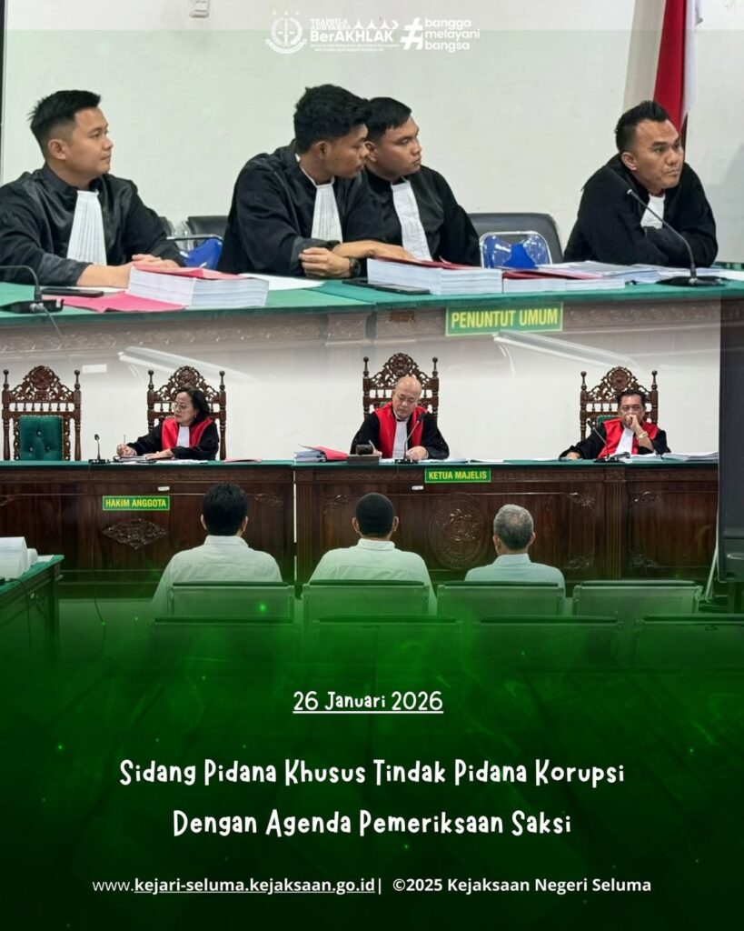 Seluma, Kejaksaan Negeri Seluma melaksanakan sidang pemeriksaan saksi perkara tindak pidana korupsi pembebasan lahan tahun 2009,2010,2011 pada Kabupaten Seluma Jaksa Penuntut Umum Kasi Pidsus Ekke Widoto Khahar S.H., M.H. Kasubsi Penuntutan Ahmad Febriansyah S.H ,Kasubsi Penyidikan M.Ikramullah Romandita S.H., Jaksa Fungsional Novy Holiansyah, S.H Bertindak sebagai Jaksa Penuntut Umum Pada Sidang ini, Senin (26/01/2026).