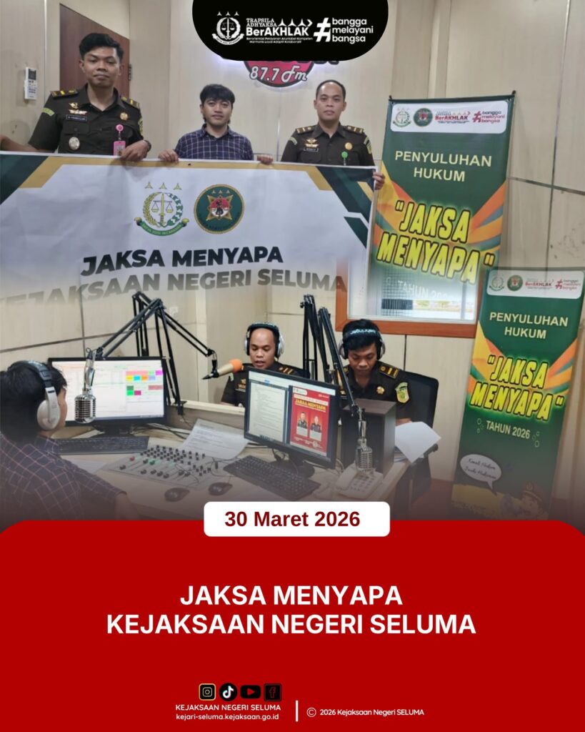 Seluma, Kejaksaan Negeri Seluma melaksanakan program Jaksa Menyapa melalui siaran Radio Semarak 87.7 FM Bengkulu dengan tema “Peran Kejaksaan dalam Mencegah Kenakalan Remaja” dengan narasumber Kasubsi I Intelijen Medrico Aditya Ednur, S.H. dan Kasubsi Penyidikan & Pengendalian Operasi M. Ikramullah Romandita Utama, S. H. Kejari Seluma berharap bisa lebih dekat dengan masyarakat melalui program Jaksa […]