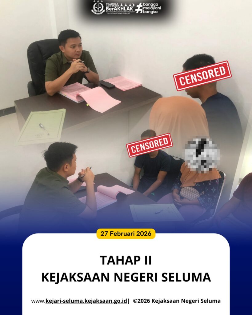 Seluma, Kejaksaan Negeri Seluma melaksanakan Tahap II dengan menerima tersangka berinisial S dengan barang bukti berupa: • 1 (Satu) Unit Sepeda Motor Honda Revo X warna hitam list merah• 1 (Satu) Lembar STNK• Uang tunai senilai Rp. 141.000 (Seratus Empat puluh satu ribu rupiah) yang diserahkan oleh Penyidik Polres Seluma pada hari Jumat tanggal 27 […]