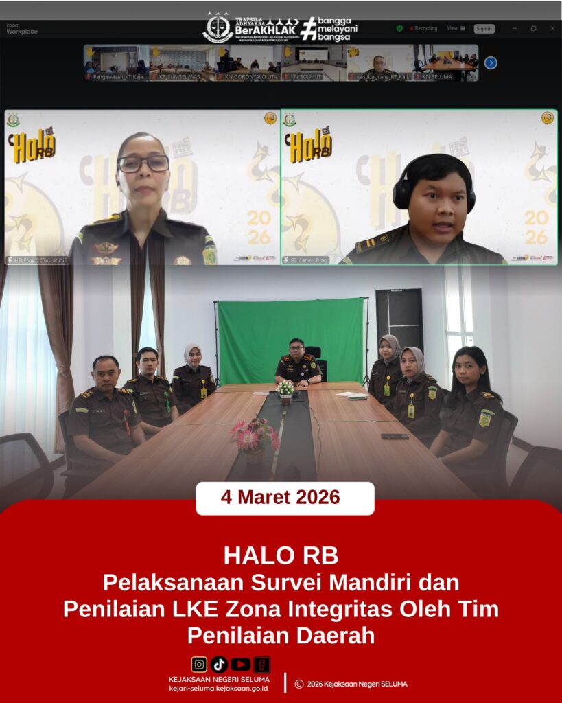 Seluma, Bertempat di Aula Kejaksaan Negeri Seluma, Kepala Kejaksaan Negeri Seluma, Bapak Janu Arsianto, S.H., M.H beserta Para Staf di Kejaksaan Negeri Seluma mengikuti kegiatan Halo RB Edisi Maret 2026 “Pelaksanaan Survei Mandiri dan Penilaian LKE Zona Integritas Oleh Tim Penilaian Daerah” secara daring melalui Zoom Meeting, Rabu (04/03/2026)
