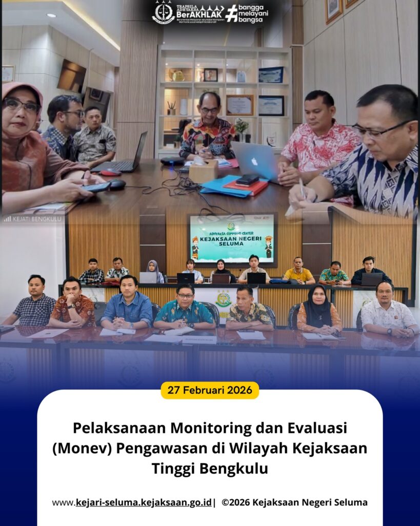 Seluma, Kepala Kejaksaan Negeri Seluma Bapak Janu Arsianto, S.H., M.H. Bersama Para Kasi, Kasubbag Bin, Kaur Keuangan dan Para Bendahara Masing-masing Bidang di Kejaksaan Negeri Seluma Mengikuti Virtual Zoom Meeting Pelaksanaan Monitoring dan Evaluasi(Monev) Pengawasan di WilayahKejaksaan Tinggi Bengkulu yang bertempat Di Aula Kejaksaan Negeri Seluma. Kegiatan ini bertujuan untuk memastikan seluruh program kerja dan […]