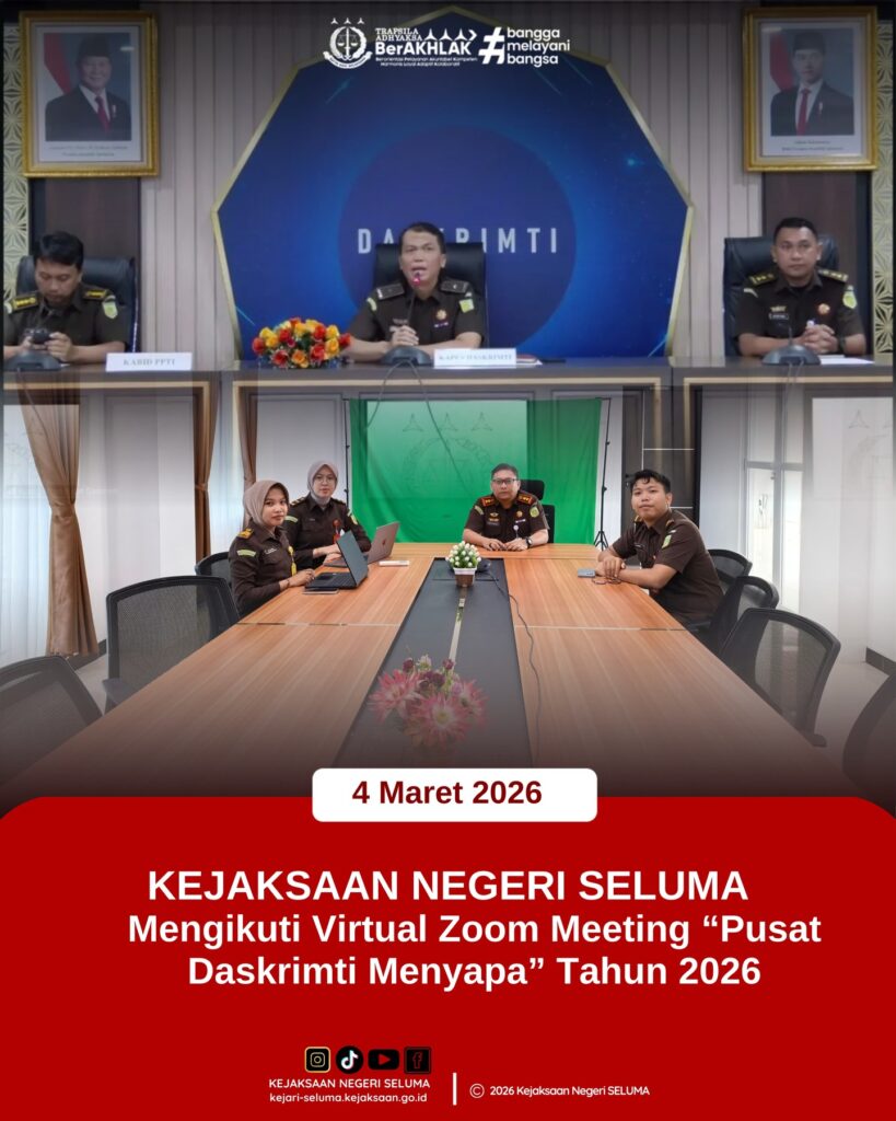 Seluma, Kepala Kejaksaan Negeri Seluma Bapak Janu Arsianto, S.H., M.H. Bersama Anggota Mengikuti Virtual Zoom Meeting “Pusat Daskrimti Menyapa” Tahun 2026 yang Bertempat di Command Center Kejaksaan Negeri Seluma. Kegiatan Ini bertujuan untuk Peningkatan Pemahaman Serta Optimalisasi Pemanfaatan CMS, Halo Pembinaan, dan Portal Satu Data Kejaksaan, Pusat data Statistik Kriminal dan Teknologi Informasi (Pusat Daskrimti, […]