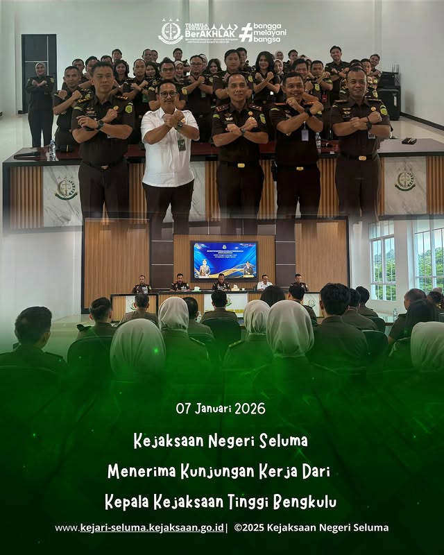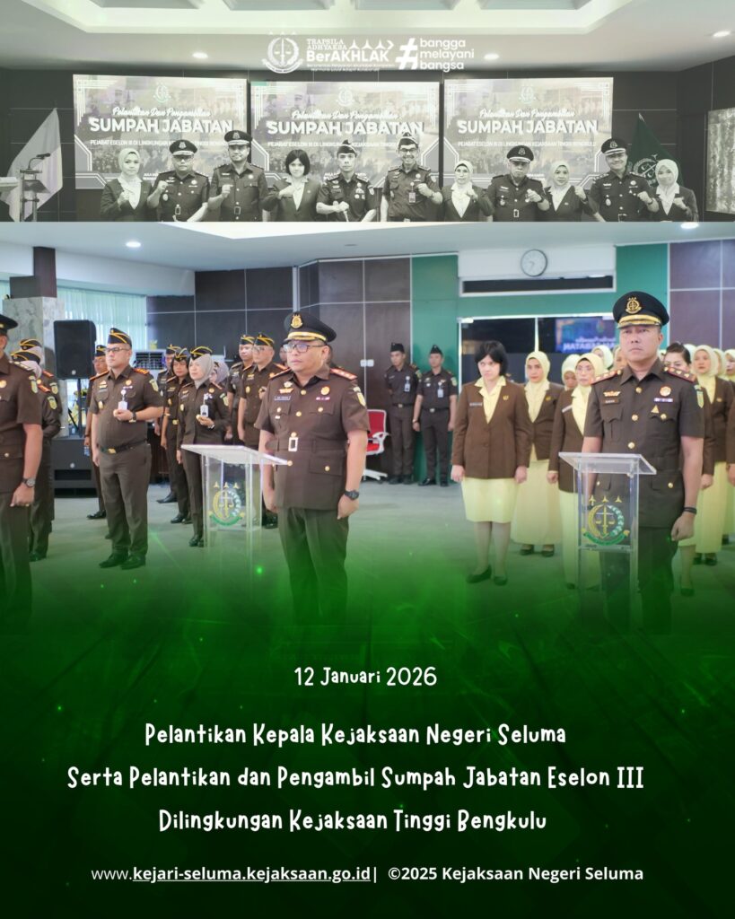 Bengkulu, – Senin, 12 Januari 2026 telah dilaksanakan pelantikan Kepala Kejaksaan Negeri Seluma yang baru, Janu Arsianto, S.H., M.H., bertempat di Aula Kejaksaan Tinggi Bengkulu. Pelantikan tersebut dipimpin langsung oleh Kepala Kejaksaan Tinggi Bengkulu, Bapak Victor Antonius Saragih Sidabutar, S.H., M.H. Dalam kesempatan ini, Janu Arsianto, S.H., M.H. resmi menggantikan Bapak Dr. Eka Nugraha, S.H., […]