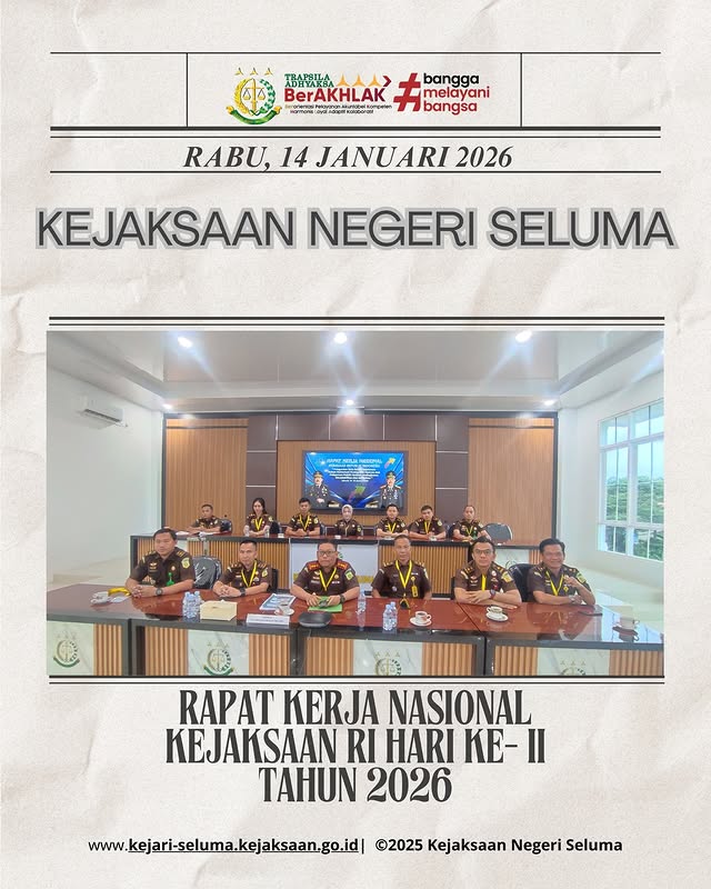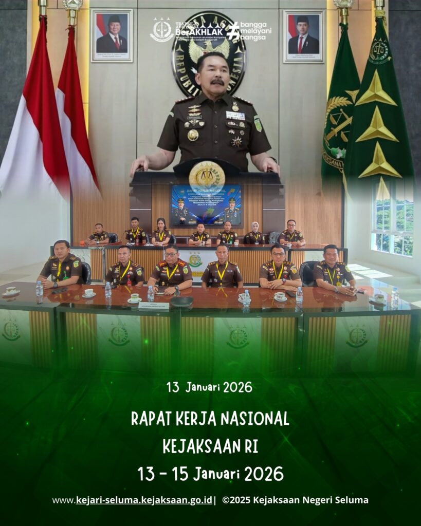 Seluma, 13 Januari 2026 – Mengawali tahun dengan semangat transformasi dan integritas. Bertempat di aula video conference, Kepala Kejaksaan Negeri Seluma, Bapak Janu Arsianto, S.H., M.H., bersama Kasubbag Bin, Para Kasi, Kasubsi mengikuti pembukaan Rapat Kerja Nasional Kejaksaan Republik Indonesia Tahun 2026. Kegiatan ini diikuti secara virtual melalui sarana Zoom Meeting dan dijadwalkan berlangsung selama […]