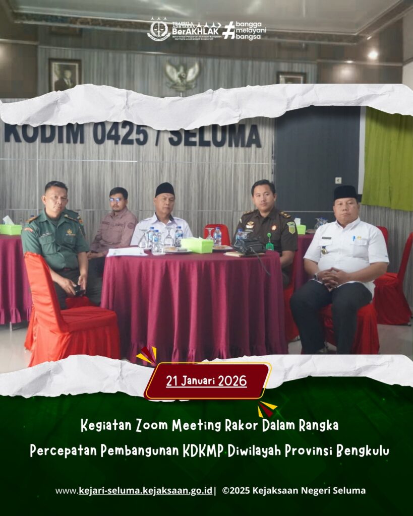 Seluma, Bertempat di Makodim 0425/Seluma Kejaksaan Negeri Seluma yang di wakilkan Oleh Kasi Intel Bapak Renaldho Ramadhan, S.H., M.H. menghadiri kegiatan zoom meeting Rakor Bersama dalam rangka pembangunan KDKMP Diwilayah Provinsi Bengkulu, Rabu (21/01/2026).