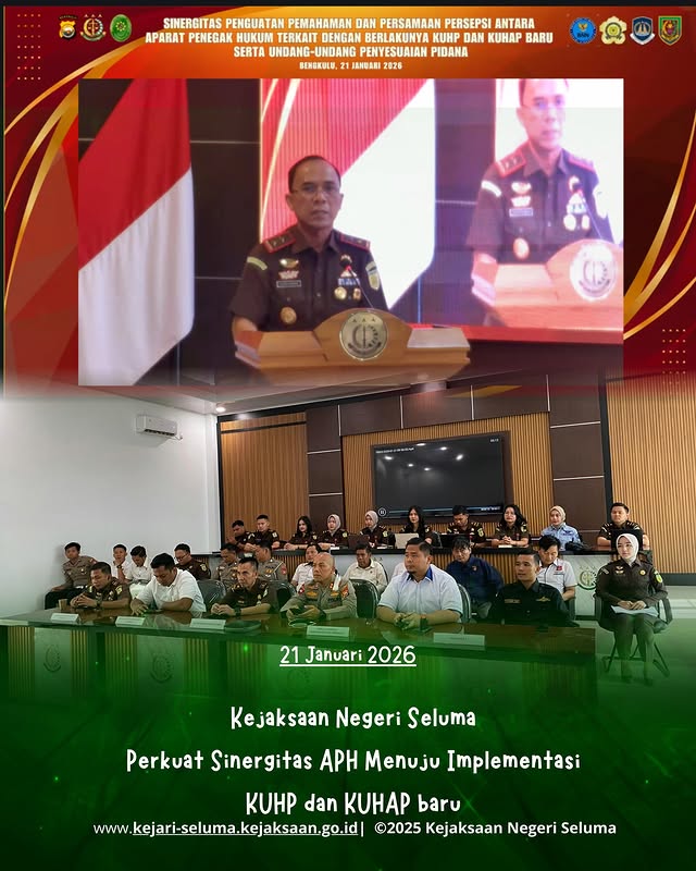 Bengkulu, Kepala Kejaksaan Negeri Seluma Bapak Janu Arsianto, S.H., M.H. menghadiri kegiatan “LAUNCHING DIGITALISASI LAYANAN KUHP DAN KUHAP” yang dilaksanakan di Kejaksaan Tinggi Bengkulu. Dalam kegiatan tersebut, dihadiri langsung oleh Kepala Kejaksaan Tinggi Bengkulu, Victor Antonius Saragih Sidabutar, S.H., M.H., didampingi oleh Wakil Kepala Kejaksaan Tinggi Bengkulu, Dr. Muslikhuddin, S.H., M.H. Turut hadir dalam kegiatan […]