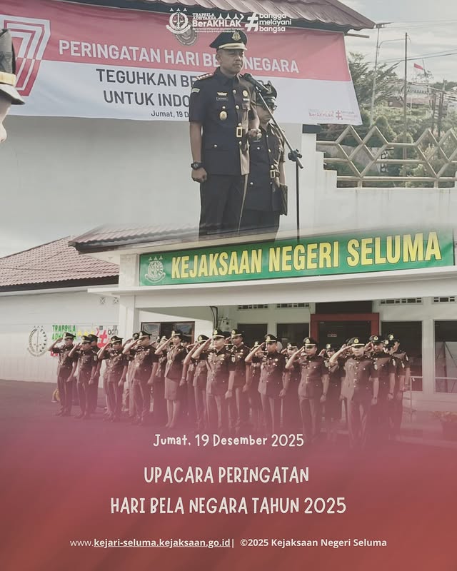 Seluma, Upacara Memperingati Hari Bela Negara Ke-77 Kepala Kejaksaan Negeri Seluma Bapak Dr. Eka Nugraha, S.H., M.H., selaku inspektur upacara yang diikuti oleh Para Kasi serta seluruh pegawai Kejaksaan Negeri Seluma.di Halaman Kantor Kejaksaan Negeri Seluma. Dengan semangat Bela Negara, mari kita perkuat persatuan, integritas, dan pengabdian kepada bangsa dan negara. Bela Negara adalah tanggung […]