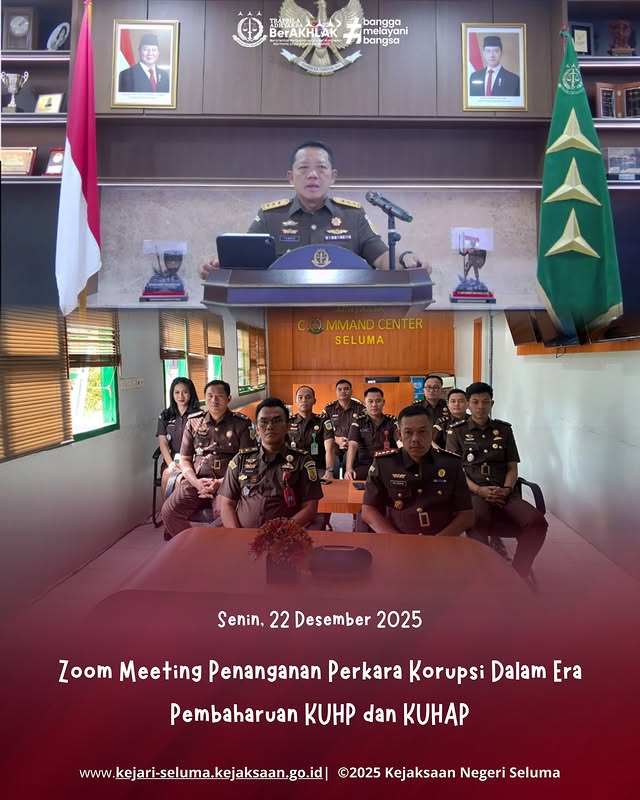 Seluma, Kepala Kejaksaan Negeri Seluma Dr. Eka Nugraha, S.H., M.H. bersama Kasi Pidum,Kasi Datun, Para Kasubsi, Jaksa Fungsional dan Calon Jaksa mengikuti kegiatan Zoom Meeting Pengarahan Jaksa Agung Muda Tindaki Pidana Umum terkait Berlakunya KUHP dan KUHAP baru di ruang Command Center Kejaksaan Negeri Seluma. Kegiatan Pengarahan Jaksa Agung Muda Tindak Pidana Umum terkait implementasi […]
