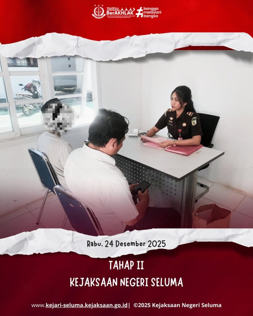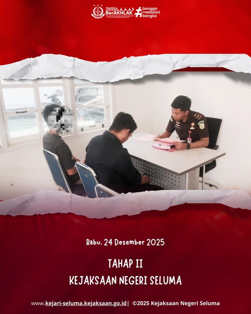 Seluma, Kejaksaan Negeri Seluma melaksanakan Tahap II dengan menerima tersangka berinisial WS dengan barang bukti berupa:– 10 (sepuluh) tandan buah kelapa sawit– 1 (satu) lembar nota timbang buah kelapa sawit Yang diserahkan oleh Penyidik Polres Seluma pada hari Kamis tanggal 24 Desember 2025 kepada Jaksa Penuntut Umum (JPU) Medrico Aditya Ednur, S.H. Kasus ini mengacu […]