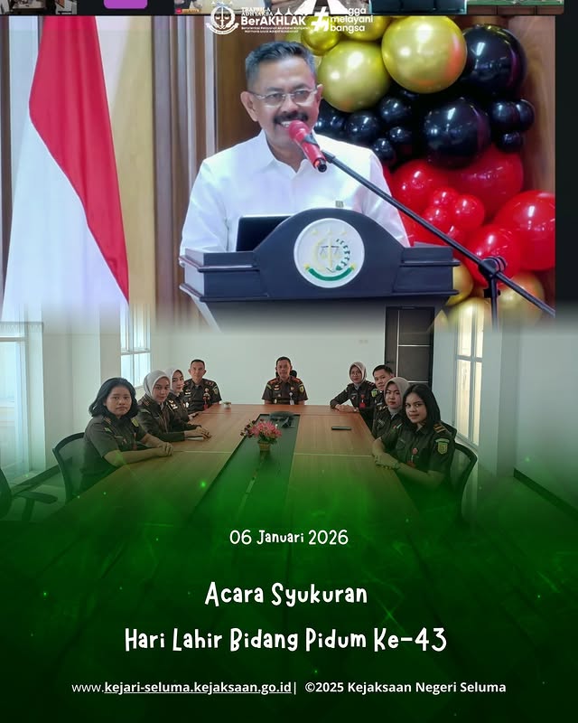 Seluma, Kepala Kejaksaan Negeri Seluma Dr. Eka Nugraha, S.H., M.H bersama kasi Pidum Alman Noveri, S.H., M.H., Jaksa Fungsional, Calon Jaksa mengikuti kegiatan Zoom Meeting Acara Syukuran hari lahir Bidang Pidana Umum Ke – 43. Acara Syukuran Hari Lahir Bidang Tindak Pidana Umum (Pidum) ke-43 sebagai wujud rasa syukur dan komitmen dalam meningkatkan profesionalisme serta […]