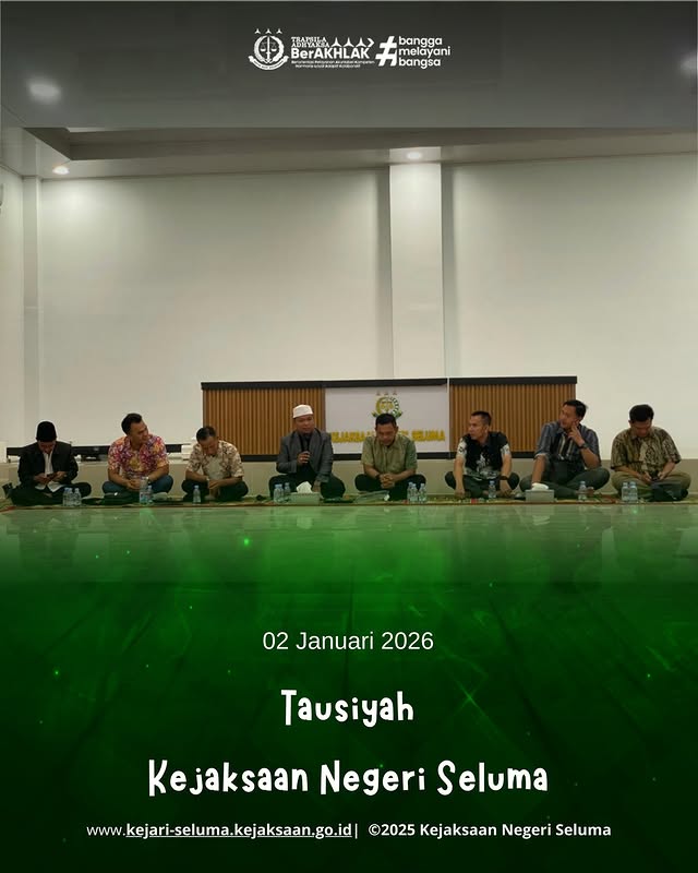 Seluma, Kejaksaan Negeri Seluma telah melaksanakan Tausiyah bersama yang diikuti oleh seluruh pegawai. Kegiatan ini dilaksanakan di Aula Kejaksaan Negeri Seluma sebagai sarana memperkuat iman, mempererat silaturahmi, serta menumbuhkan semangat bekerja dengan penuh integritas, Jum’at (02/12/2025)