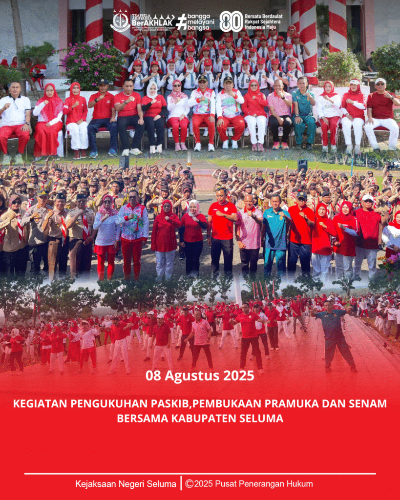 Kepala Kejaksaan Negeri seluma Dr. Eka Nugraha, S.H., M.H.,menghadiri Kegiatan Pengukuhan Paskib,Pembukaan Peramuka dan Senam Bersama kabupaten Seluma, 08 Agustus 2025 yang digelar pada Halaman kantor Bupati seluma.