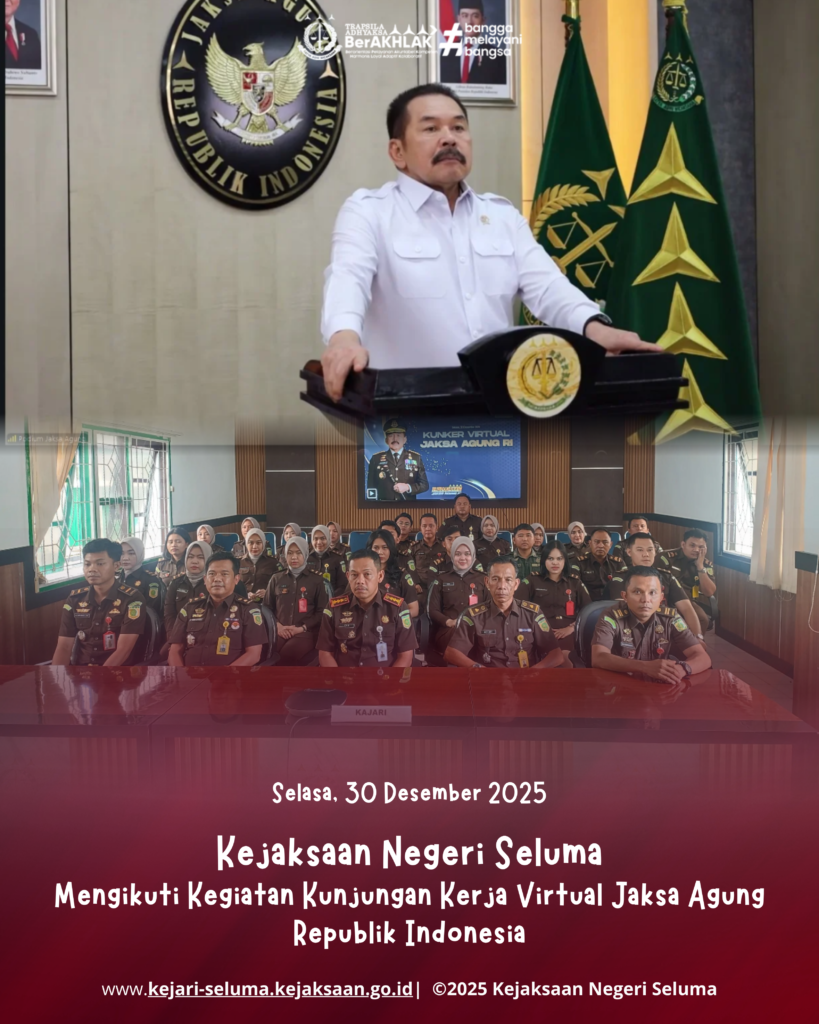bertempat di Aula Kejaksaan Negeri Seluma, Kepala Kejaksaan Negeri Seluma bersama Kasubagbin, Para Kasi, Jaksa Fungsional serta Seluruh Pegawai Kejaksaan Negeri Seluma mengikuti Kunjungan Kerja Jaksa Agung Republik Indonesia yang dilakukan secara virtual melalui zoom meeting.