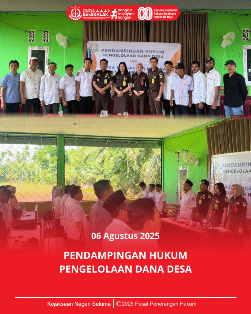 senin, 06 Agustus 2025 bidang Perdata dan Tata Usaha Negara Kejaksaan Negeri Seluma bertempat di kantor Camat Air Periukan , Kepala Seksi Perdata dan Tata Usaha Negara M.Ridho Saputra, S.H., Melaksanakan giat Sosialisasi Pendampingan Hukum Pengelolaan Dana Desa di sertai Sosialisasi layanan Hukum Gratis Halo JPN yang diikuti oleh Dinas PMD dan Kepala Desa Di Tiga Kecamatan yaitu Kecamatan Sukaraja, Air Priukan dan Lubuk Sandi