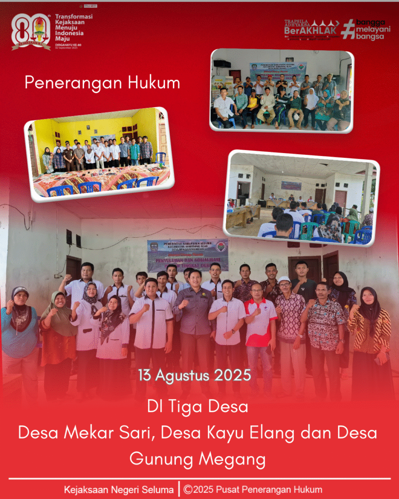 Kejaksaan Negeri Seluma melalui Kepala Seksi Intelijen Renaldho Ramadhan, S.H., M.H., Kasubsi II Intelijen Egen Novghantara, S.H. dan Anggota menghadiri sekaligus menjadi narasumber dalam kegiatan Penerangan hukum yang diselenggarakan di tiga Tempat berbeda yaitu Desa Mekar Sari, Desa Kayu Elang dang Desa Gunung Megang Kabupaten Seluma pada hari Rabu tanggal 13 Agustus 2025.