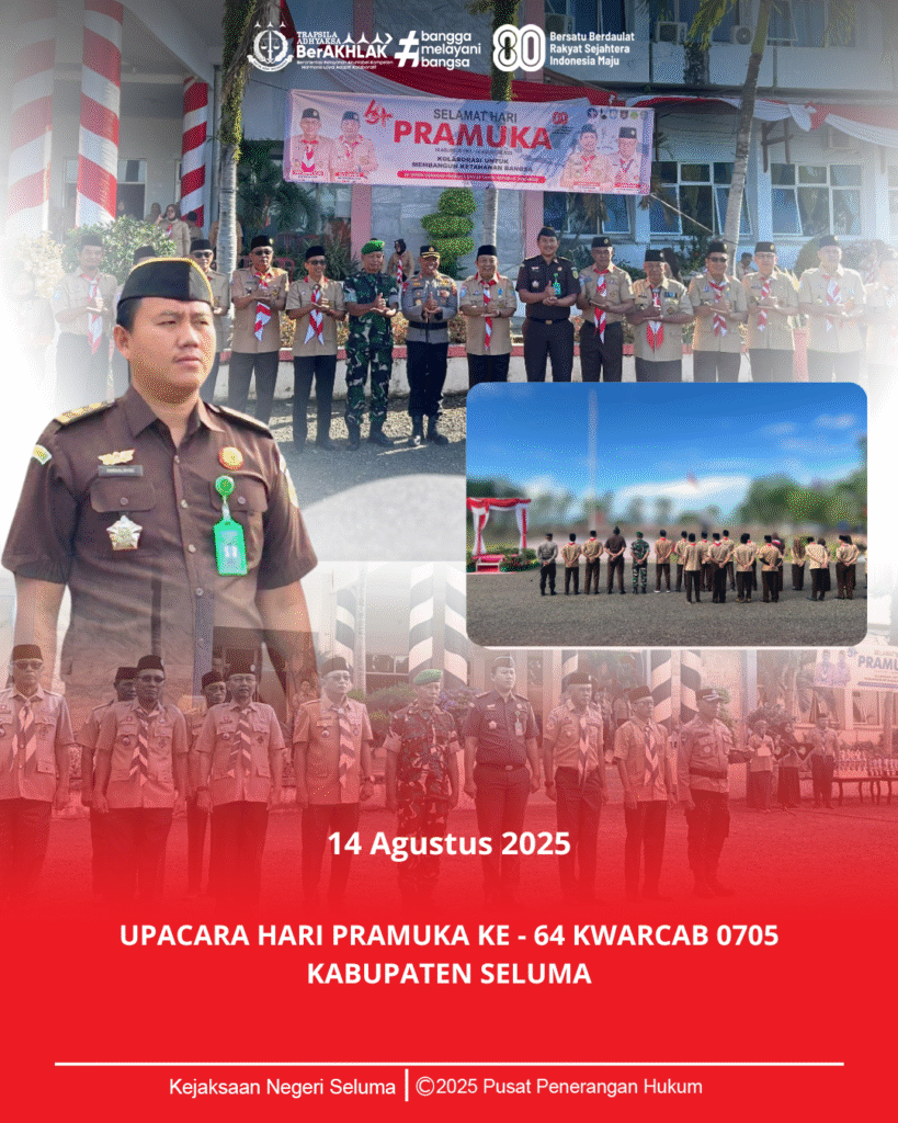 Kejaksaan Negeri Seluma melalui Kepala Seksi Intelijen Renaldho Ramadhan, S.H., M.H., dan Anggota menghadiri Kegiatan Upacara Memperingati Hari Pramuka Ke – 64 Tahun 2025 Kabupaten Seluma pada hari Kamis tanggal 14 Agustus 2025.